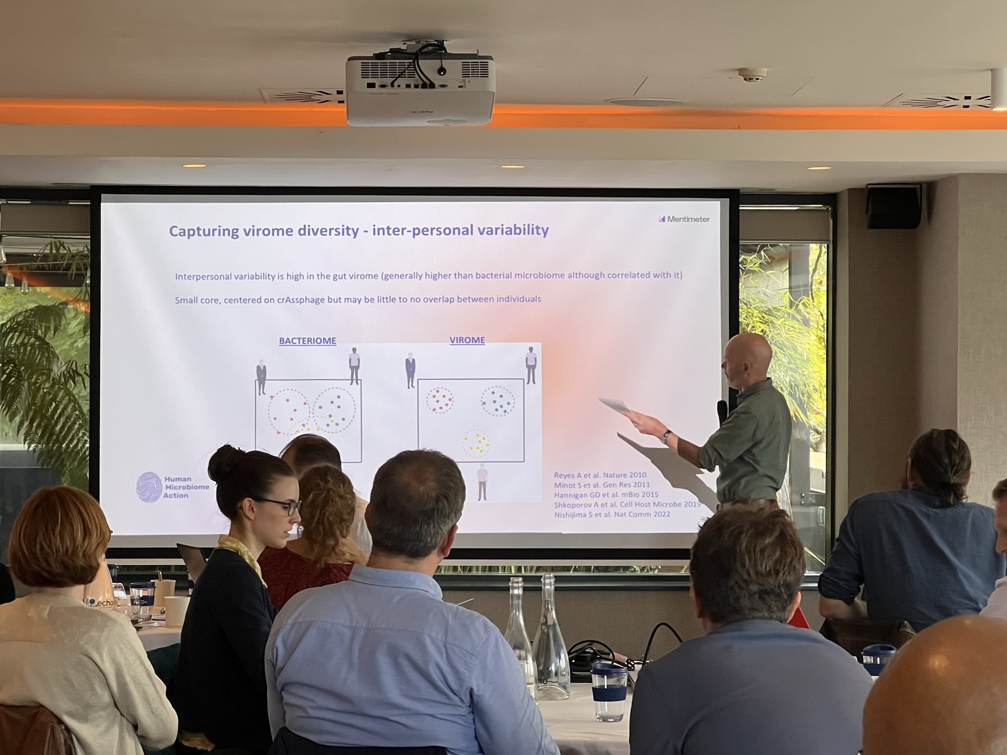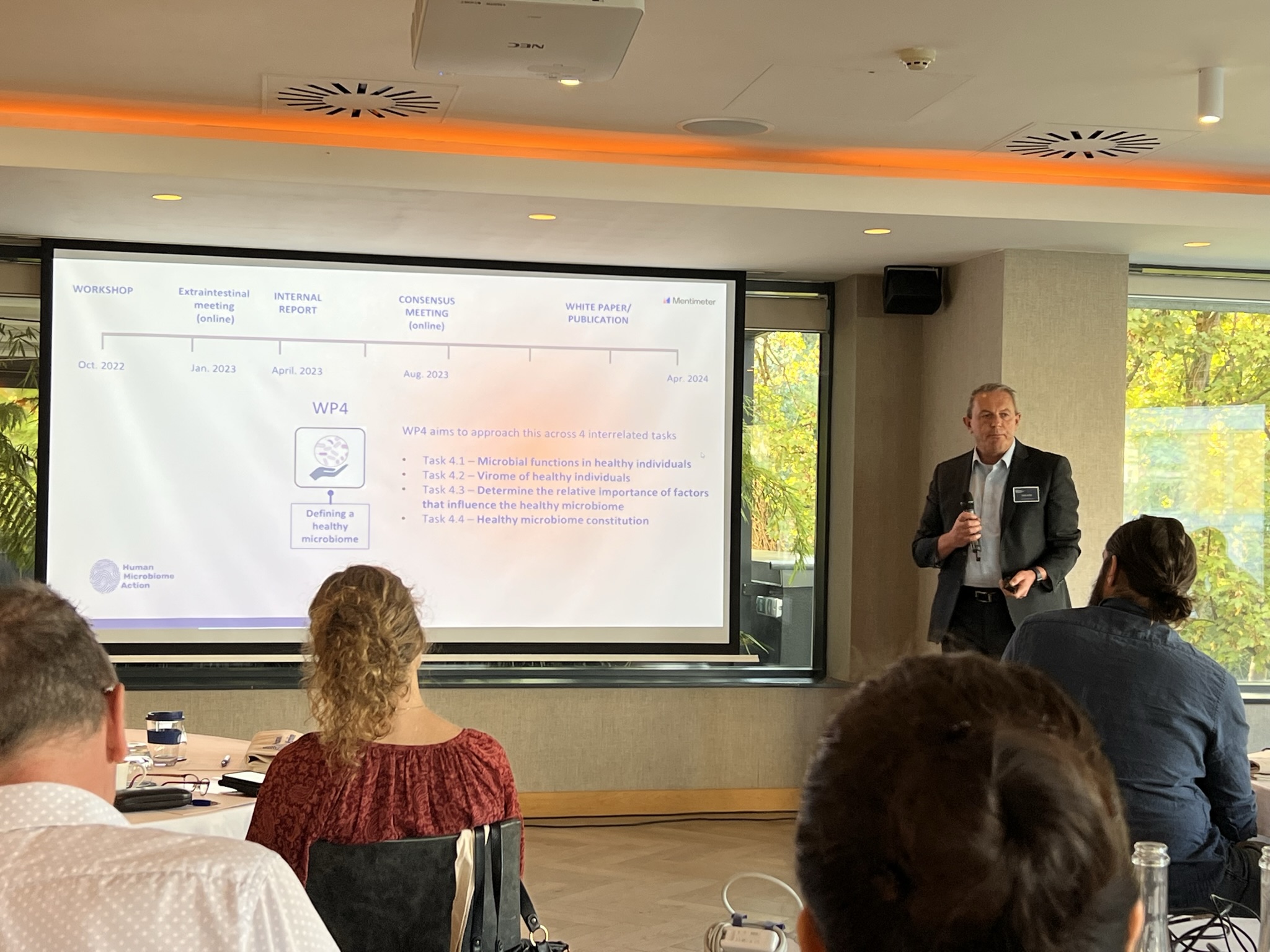 The Human Microbiome Action workshop on defining a healthy microbiome and virome was held on the 6th of October at the River Lee Hotel in Cork, Ireland. A total of 30 international top-ranked scientists in the microbiome field gathered in a hybrid format to discuss the current state of the art, as well as the future of microbiome science. In aiming to keep Europe at the forefront of microbiome research, the workshop activities were tailored to reach a consensus on research practices and study design needed to define a healthy microbiome and virome with future research. The focus was thereby to discuss a healthy functional core of the microbiome across different body sites, factors influencing its composition and function as well as a methodology to capture them.